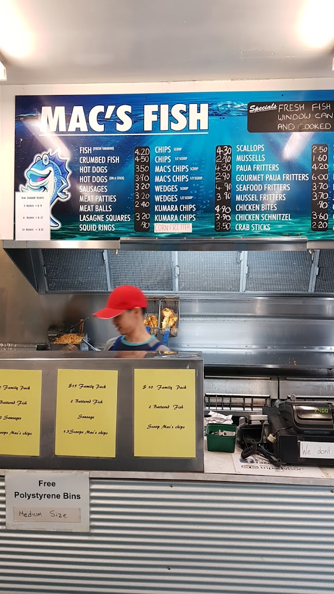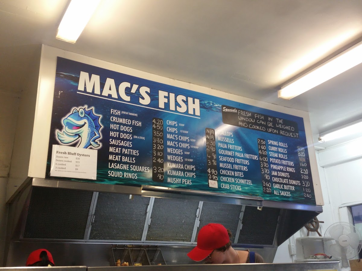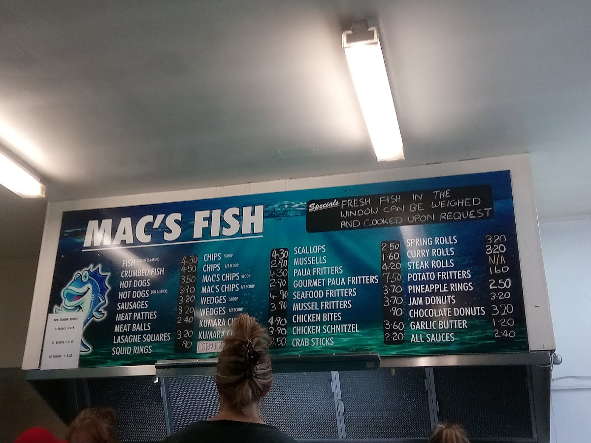 Mac's Fish Supply offers a variety of classic and gourmet seafood options that are sure to satisfy any craving. For those seeking something special, the Mussels and Paua Fritters are excellent choices, with the Gourmet Paua Fritters standing out for a more indulgent experience. The Seafood Fritters and Mussel Fritters are perfect for fritter lovers. The menu also features several other tasty options like Fish, Crumbed Fish, and comforting Hot Dogs. For sides, you can’t go wrong with the crispy Chips or the signature Mac's Chips, adding a flavorful twist to any meal. Whether you’re in the mood for something light or a heartier option, Mac's Fish Supply has a well-rounded selection to satisfy your taste.